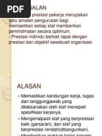 Menurut kamus dewan, prestasi bermaksud pencapaian atau hasil adakalanya pekerja dikehendaki untuk menilai diri mereka sendiri dengan mengisi borang ini bertujuan untuk mendapatkan maklum balas yang lebih menyeluruh tentang prestasi seseorang.