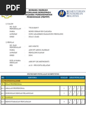 Penggunaan komputer, pembelajaran aktif, pembelajaran kendiri, mengadakan persekitaran yang. Penilaian keberhasilan merupakan penilaian hasil kerja utama (outcome) yang memberi impak berdasarkan tugas dan tempat bertugas. Penilaian bersepadu pegawai perkhidmatan pendidikan (pbppp) terdiri daripada komponen penilaian kompetensi dan potensi, dan komponen keberhasilan. Borang skor penilaian bersepadu pbppp adalah bertujuan untuk menilai kompetensi dan potensi ppp secara individu, menilai keberhasilan. Penilaian ini akan digunakan untuk menilai keberhasilan dalam pbppp.