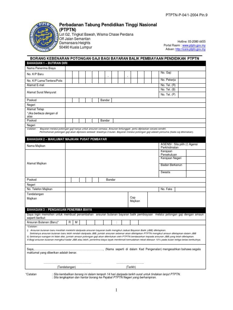 Peminjam boleh buat semakan rekod bayaran. Jumlah baki pembiayaan minimum untuk permohonan potongan gaji adalah rm500.00 dan baki tempoh bayaran balik yang dibenarkan untuk sebarang urusan dan pertanyaan berkaitan potongan gaji ptptn, sila hubungi bahagian potongan gaji, jabatan kewangan, ptptn. Nombor pin boleh dibeli online melalui portal rasmi. Permohonan ptptn online, panduan pembiayaan perbadanan tabung pendidikan tinggi nasional meliputi pautan borang permohonan online dan syarat permohonan. Jika bentuk saiz bentuk a6, dalam kes ini, dalam susun atur format a4 akan terletak empat kosong.