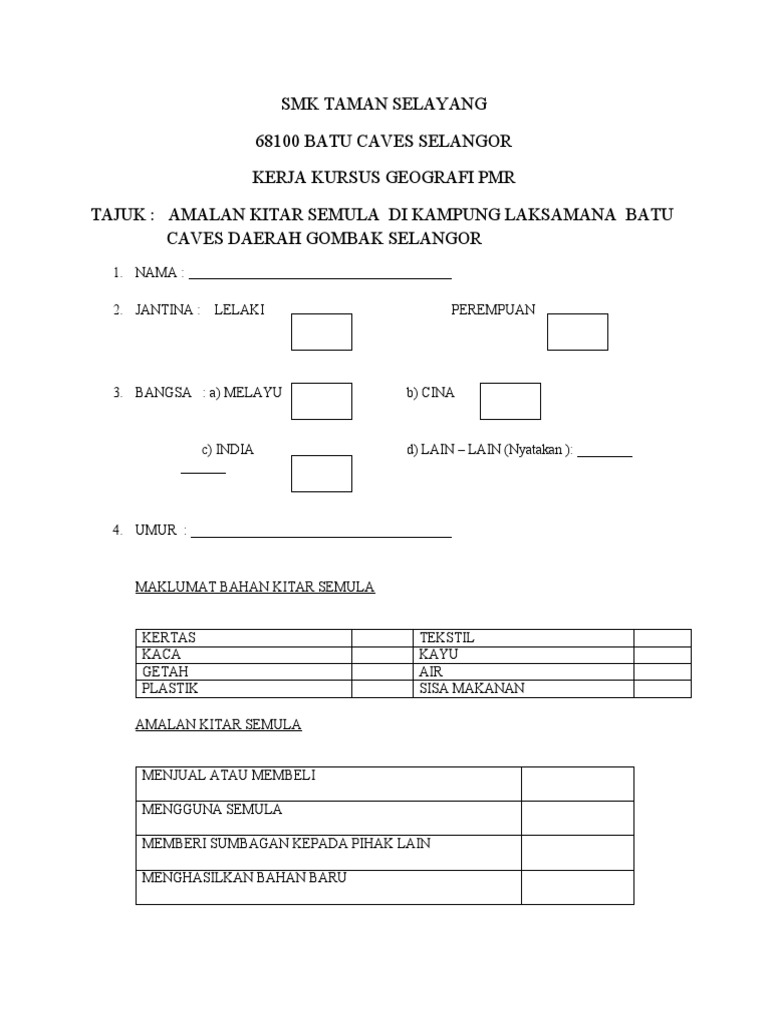 Related : Contoh Borang Soal Selidik Geografi Tingkatan 1 Sisa Domestik - Borang Soal Selidik Geografi Pencemaran Air : Calon boleh melaksanakan kajian secara berkumpulan tetapi hasil kerja mestilah dibuat secara individu..