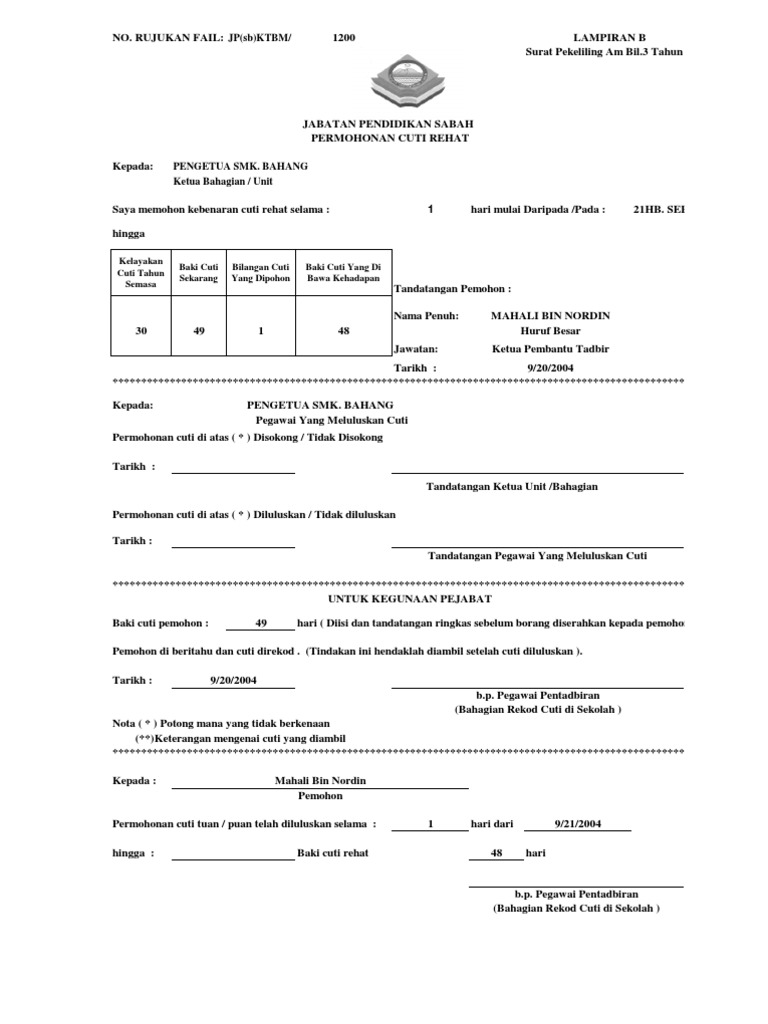 Format Borang Cuti Gantian : Cuti Gantian Kerana Mengikuti Program Penghayatan Islam ... : Borang gantian cuti rehat 2019.. Cuti adalah satu keistimewaan atau kemudahan yang diberikan oleh kerajaan kepada anggota perkhidmatan awam. Baki cuti pemohon _____ hari. Telah berusaha untuk mengambil kesemua cuti rehat saya sebelum akhir tamat kontrak dan ingin memohon supaya bakinya dapat diperincikan seperti. Bahagian f panduan permohonan cuti gantian kerana bekerja lebih masa. *borang ini hendaklah dicetak diatas kertas biru.