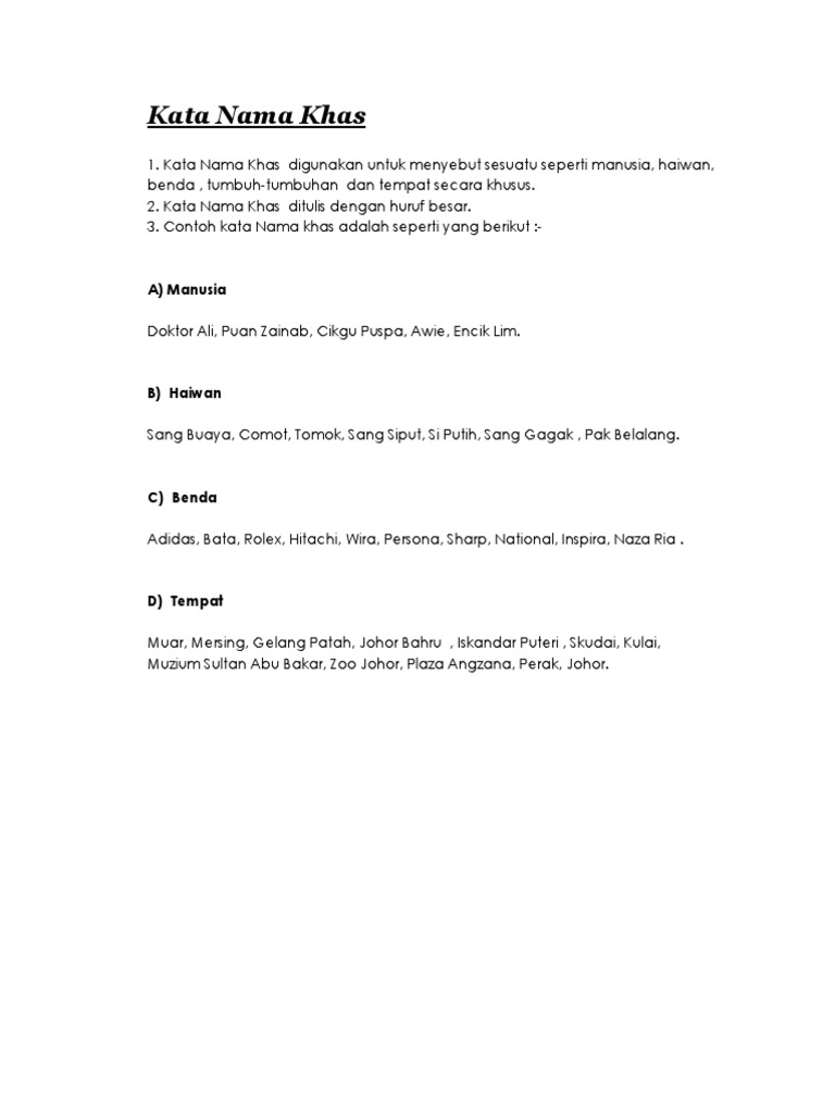 Contoh kata nama khas ialah manusia (pak hamid), binatang (sang buaya), tempat (hospital ampang), benda (perodua alza). Manusia yang disebut sebentar tadi boleh menjadi nama panggilan atau gelaran. Published on nov 22, 2011. Nama kucing saya ialah messy. Kata nama ialah perkataan yang menamakan orang, haiwan, benda, tempat atau konsep.