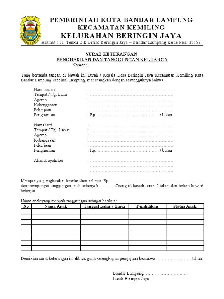 Mengurus surat semacam ini harusnya bisa langsung menemui perangkat desa atau kelurahan dan akan segera diarahkan untuk membuat surat. Bukan hanya itu, beberapa mitos dan simpang siur informasi juga diterima oleh para karyawan swasta. Total jumlah tanggungan keluarga untuk pendapatan tidak kena pajak. Sebagian besar malah mengalami dilema. Yang bertanda tangan di bawah ini lurah / kepala desa beringin jaya kecamatan kemiling kota bandar lampung propinsi lampung, menerangkan dengan sesungguhnya bahwa